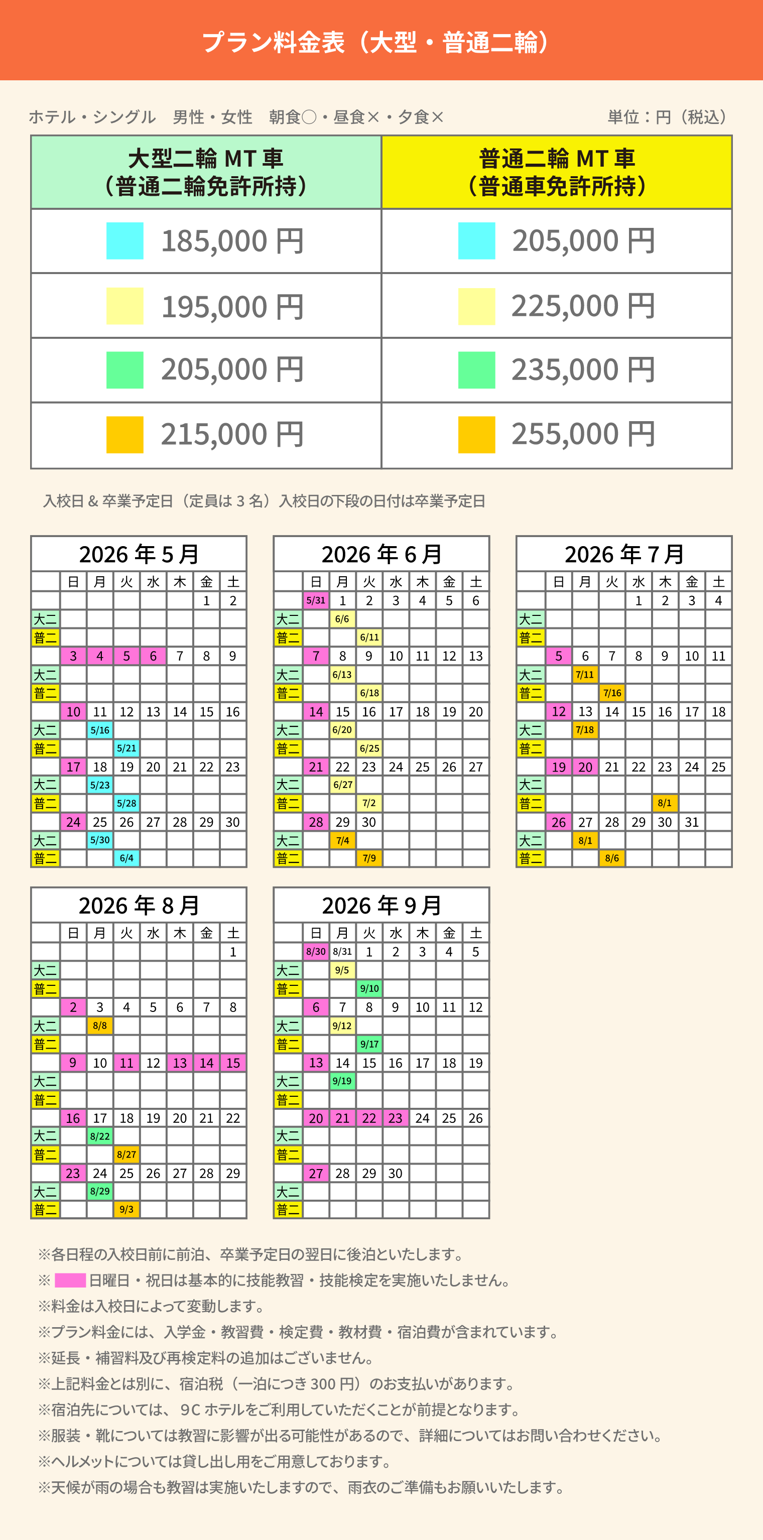 日数分は上記料金に含まれる ※1 泊分は当校実費で保証 (宿泊日数を超え延泊した場合は、延泊分を別途請求) |